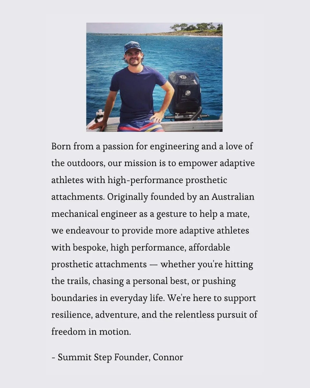 At Summit Step we engineer reliable prosthetics attachments for adaptive athletes. The bespoke nature of athletic prosthetics fuels case by case design which we endeavour to pass on to others who are seeking the similar satisfaction. Our journey begins with focus on mountaineering prosthetics.